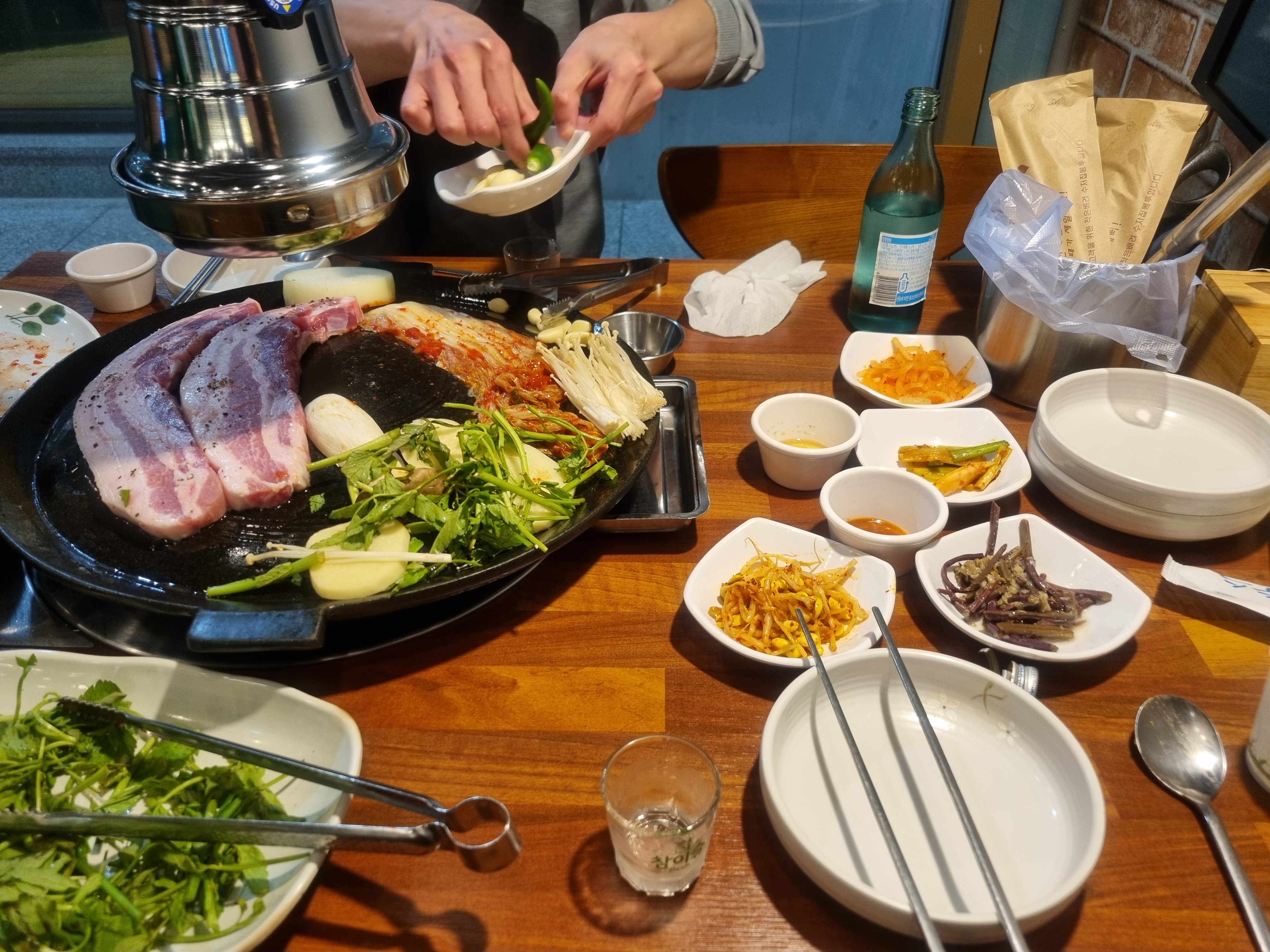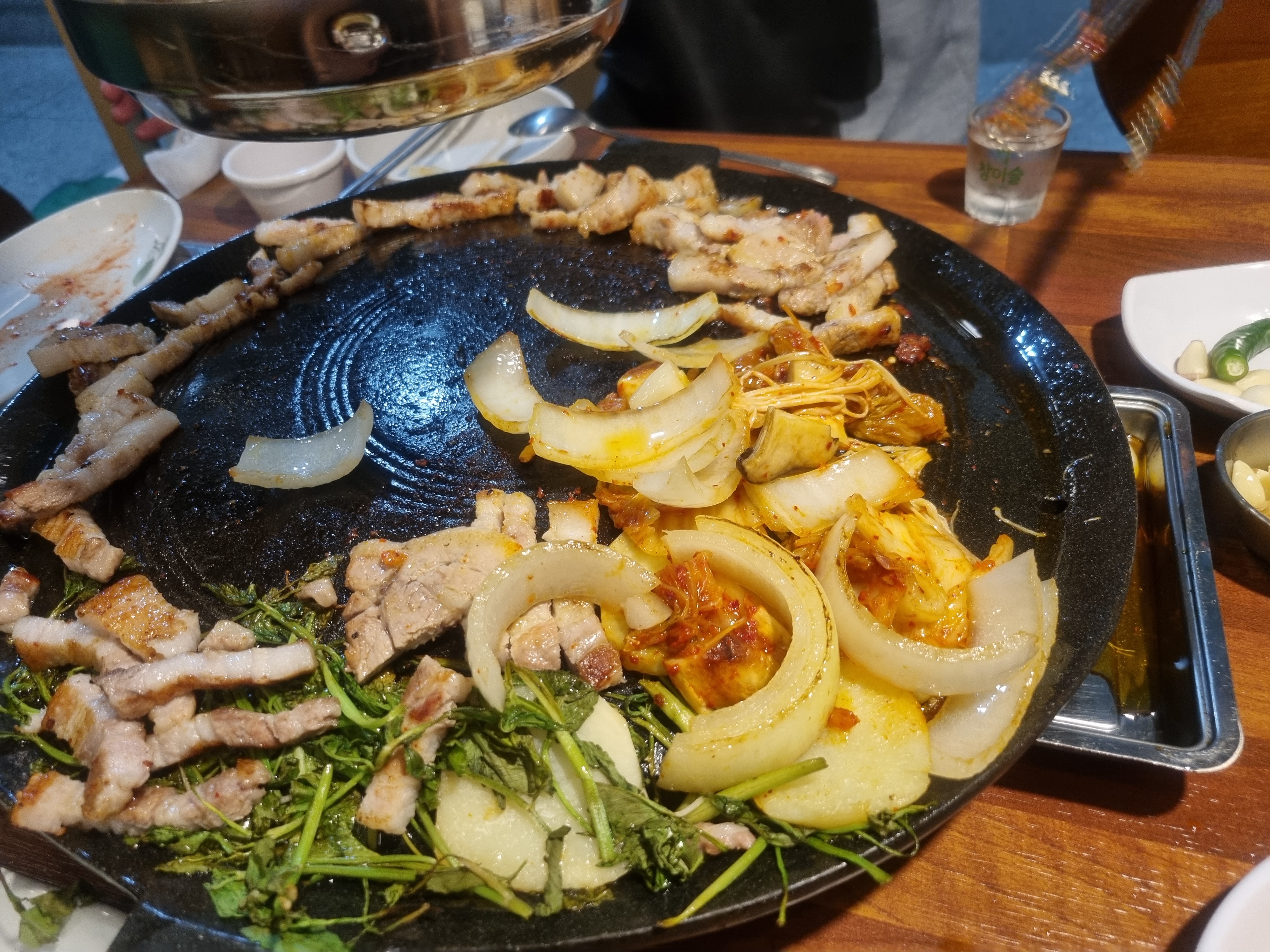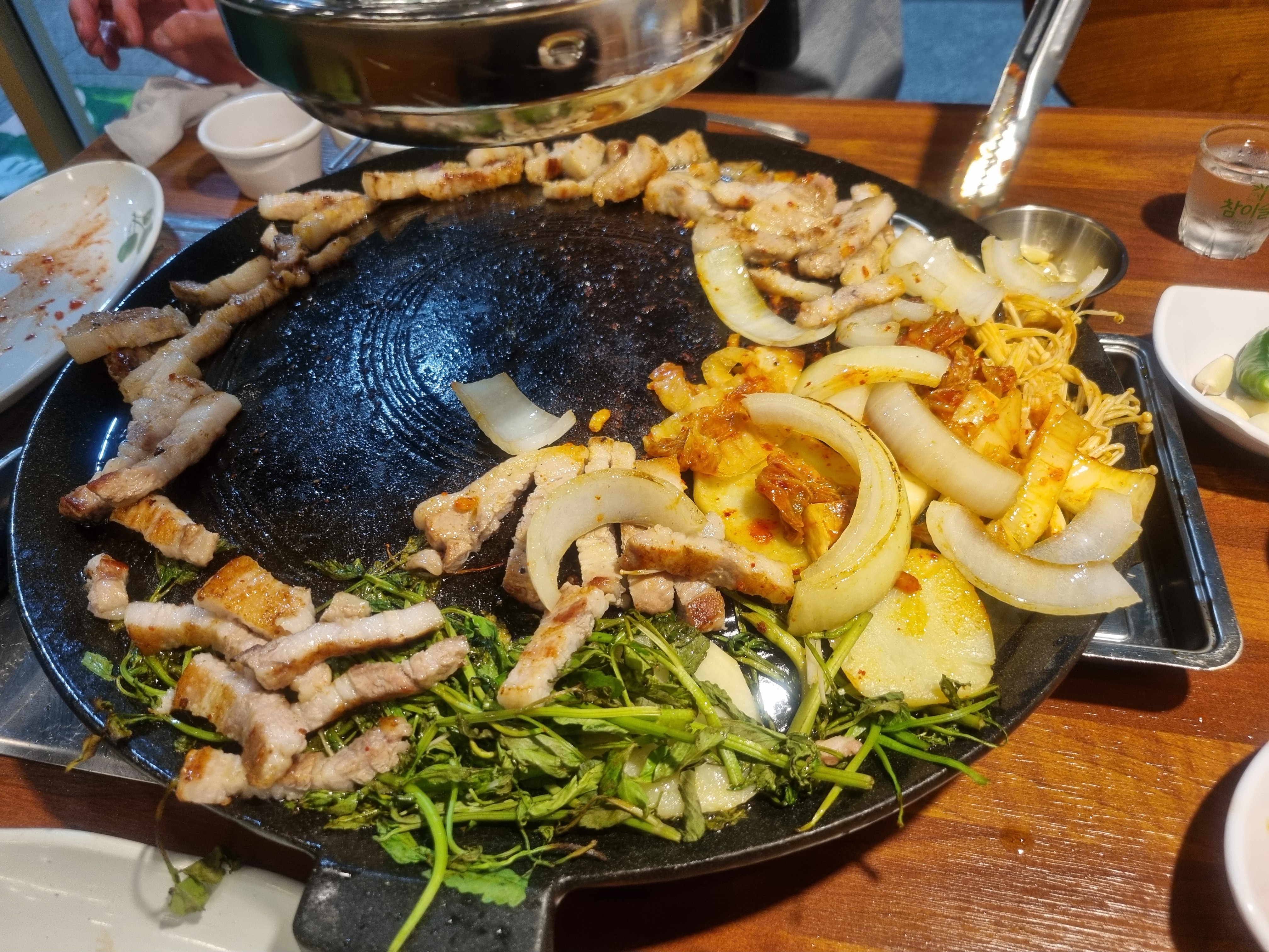 삼겹살 한판 다양한 채소 양파 미나리 팽이버섯 김치도 올려 줍니다