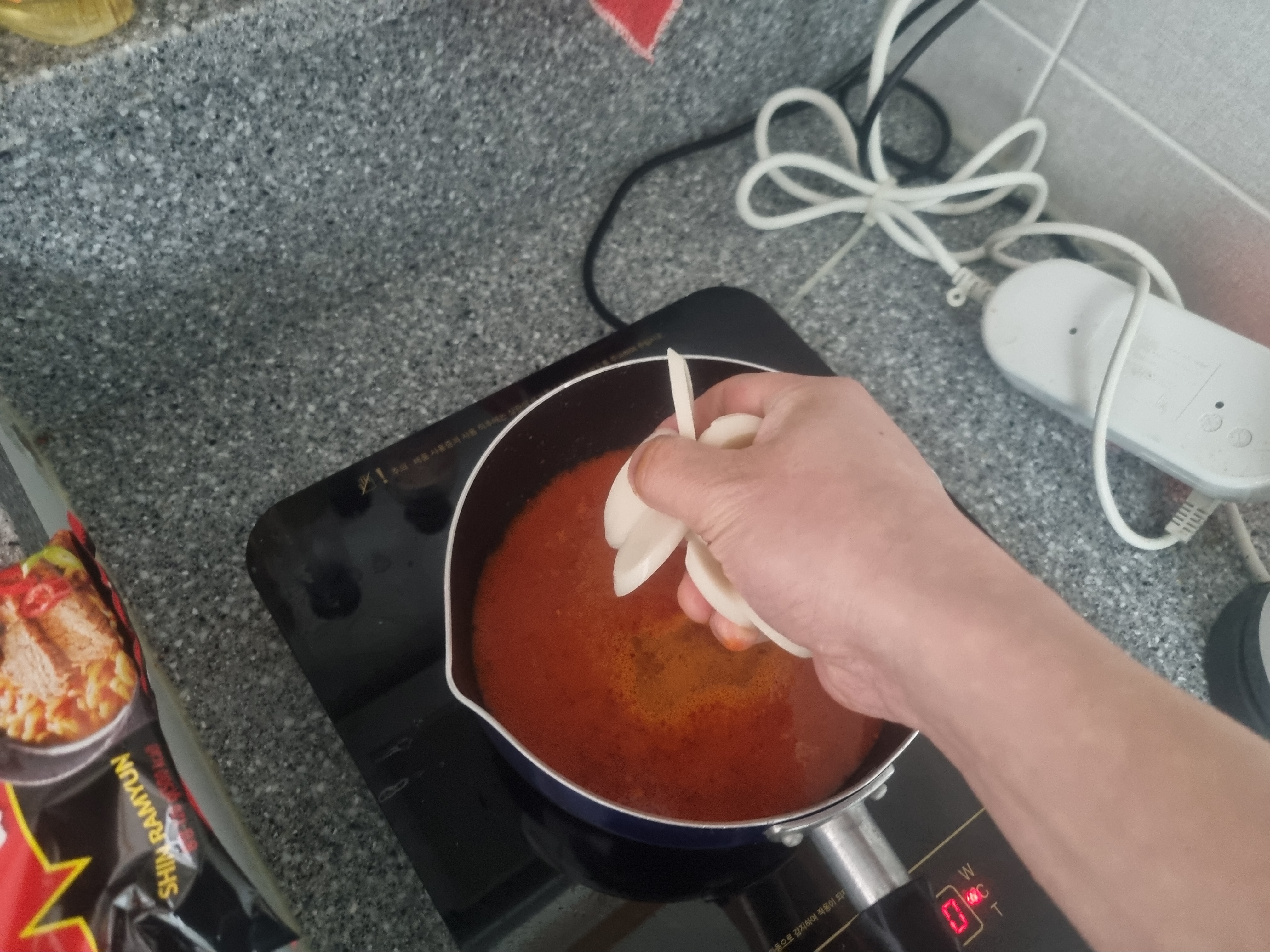 김치국을 적당히 넣고 떡사리도 넣고 하니 얼큰하게 완성입니다